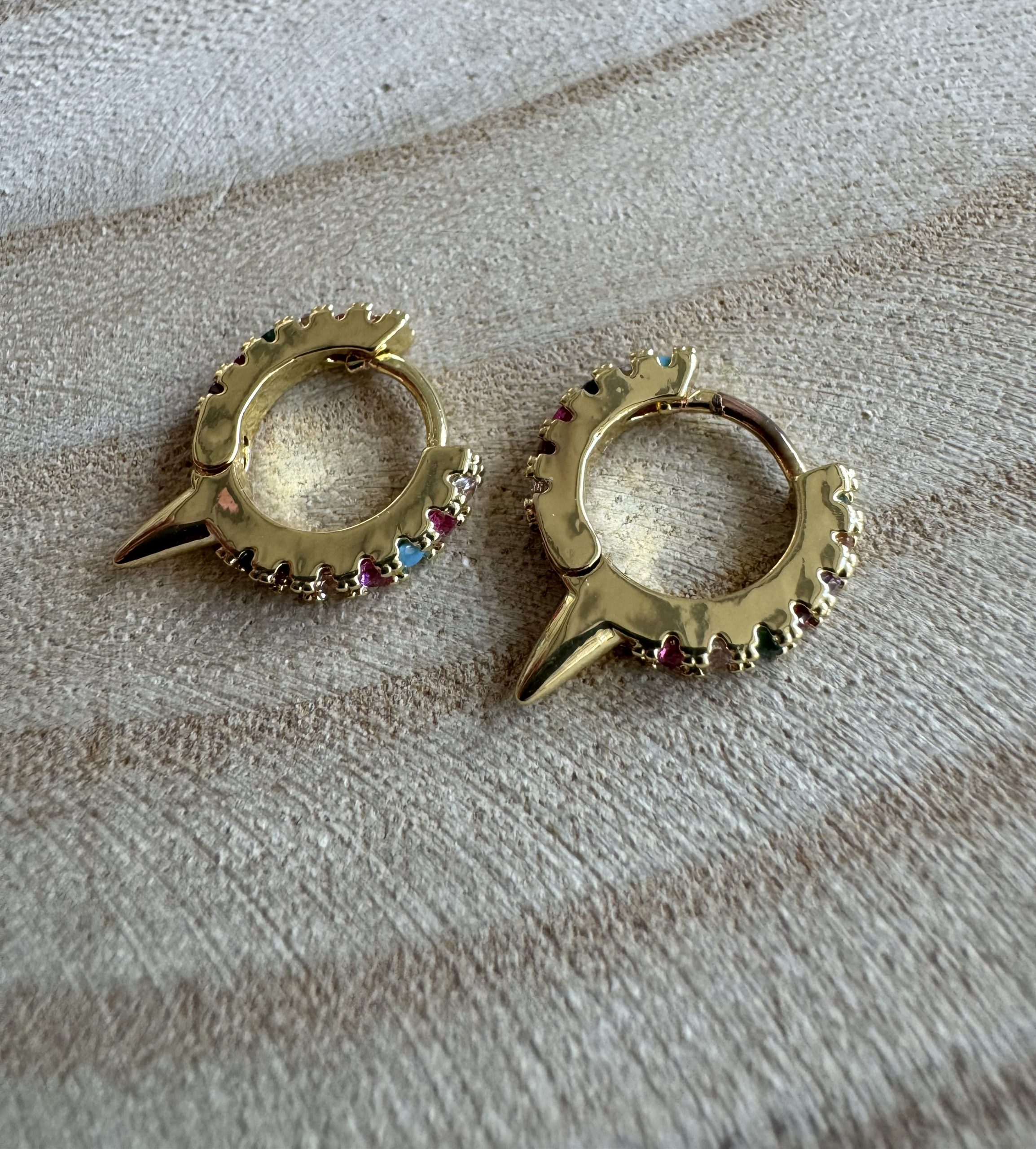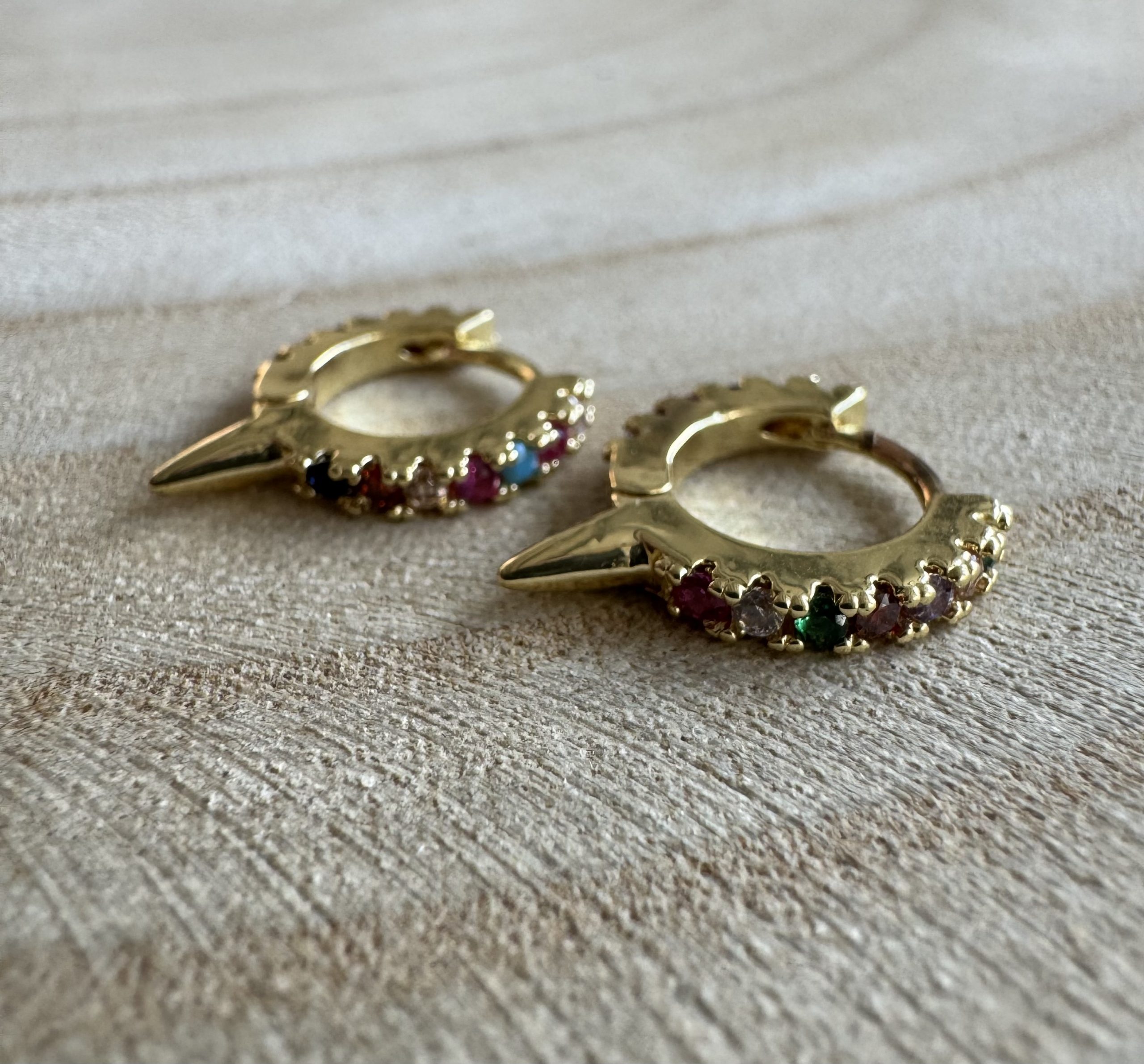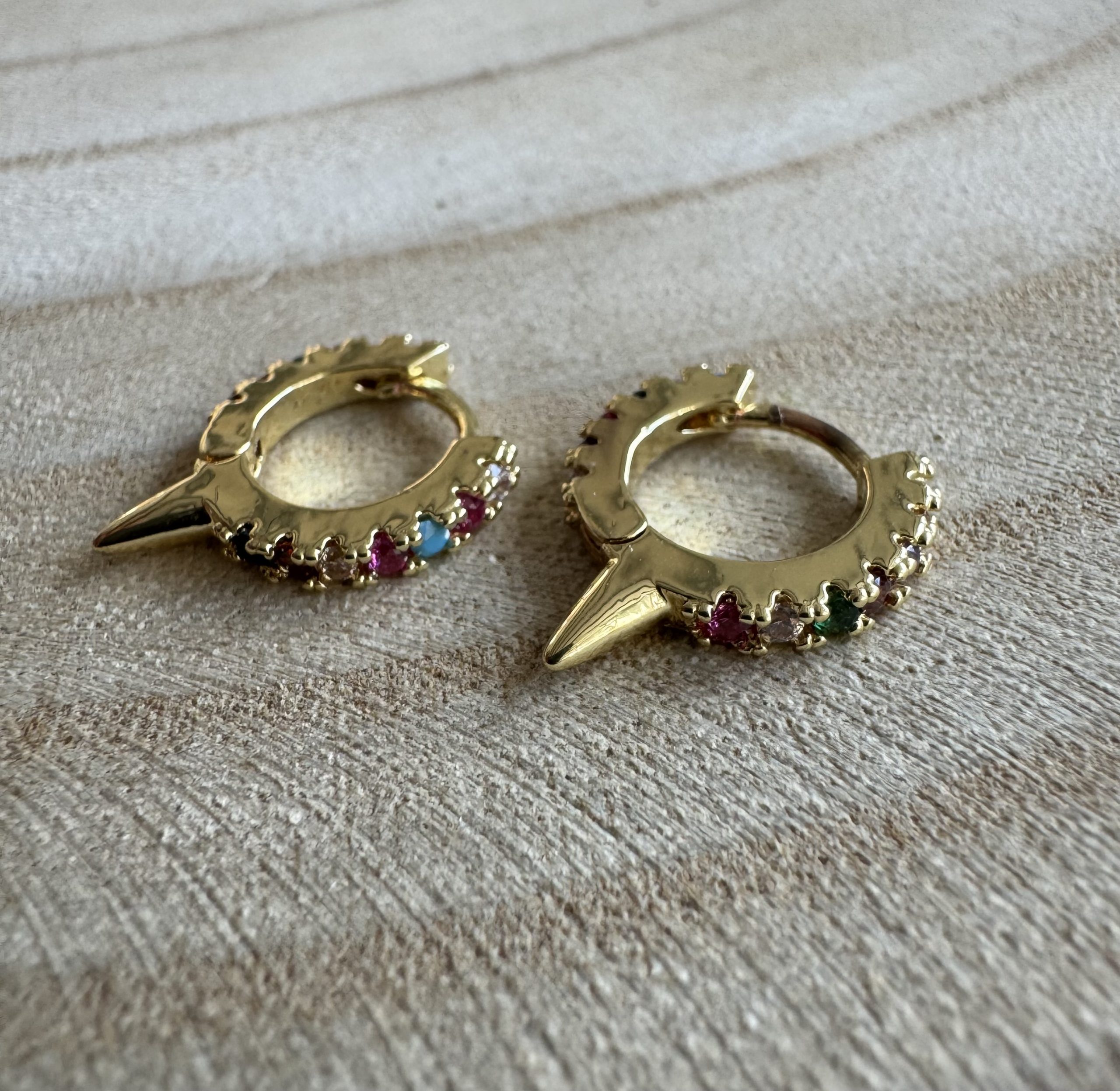 Aros acero inoxidable en color oro. Se abren por la mitad. Van decorados con un pincho en la zona central, y circonitas de colores. Miden 1cm de diámetro. Puedes ducharte y dormir con ellos. Conservan totalmente el color.