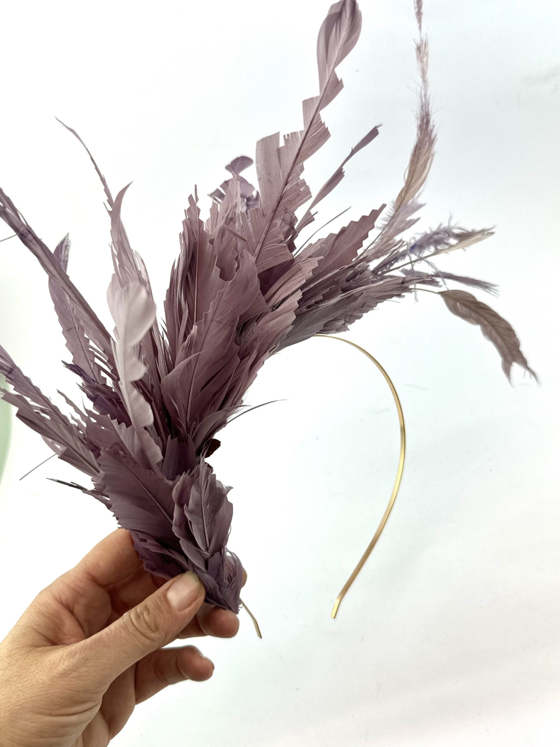 Diadema metálica plata. Va decorada con un plumero de plumas naturales en color malva, con forma de cascada. Es muy cómodo, se puede llevar con el pelo recogido o con el pelo suelto.