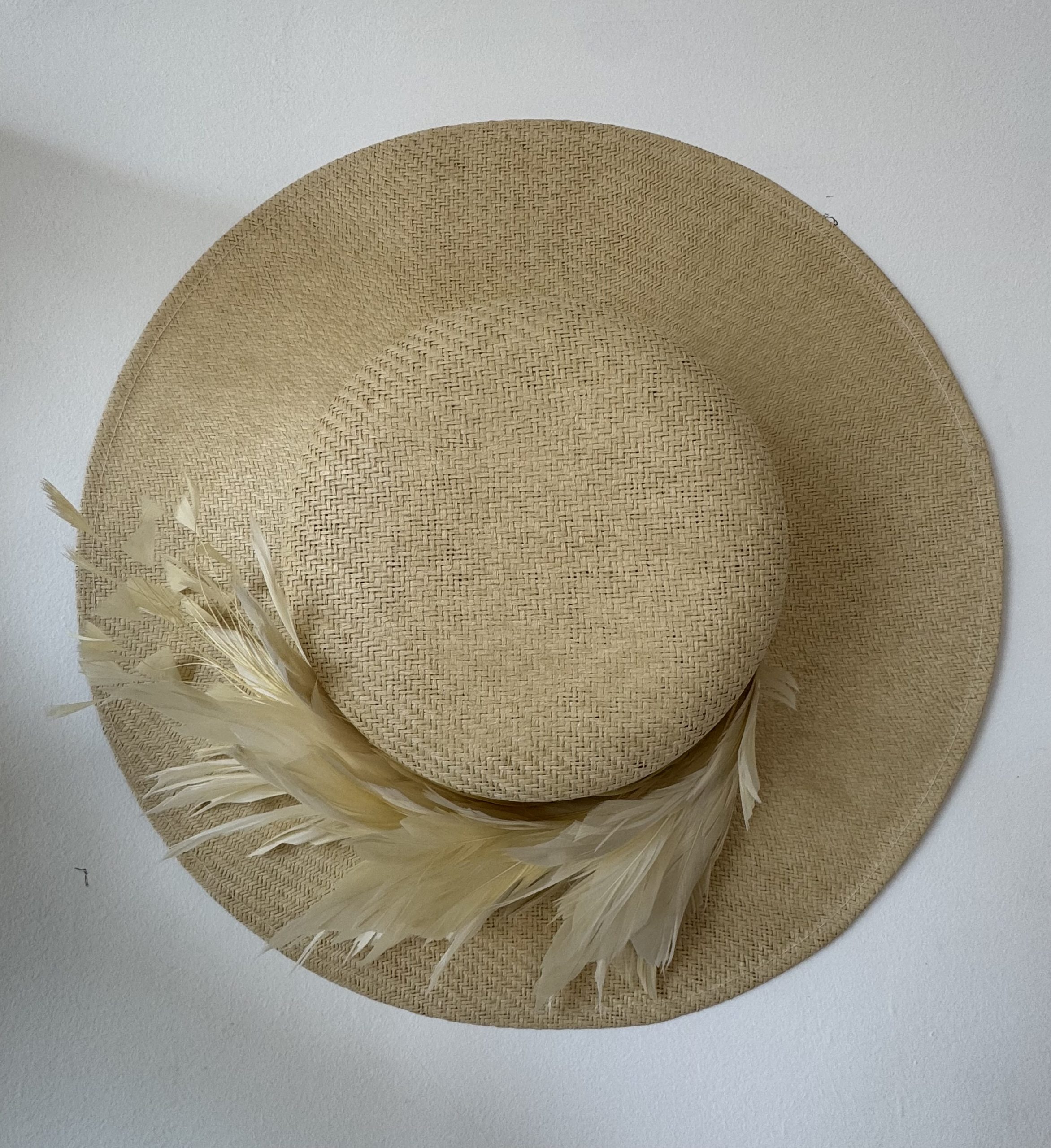 Pamela de sinamay, en color camel. Tiene un tamaño bastante mediano, mide 40cm de diámetro. Va decorada con una banda de terciopelo crudo. Va decorada con una flor de plumas naturales en color crudo. Va sujeta a la cabeza con una goma, que se coloca por detrás del pelo, así puedes darle la inclinación que tu desees.