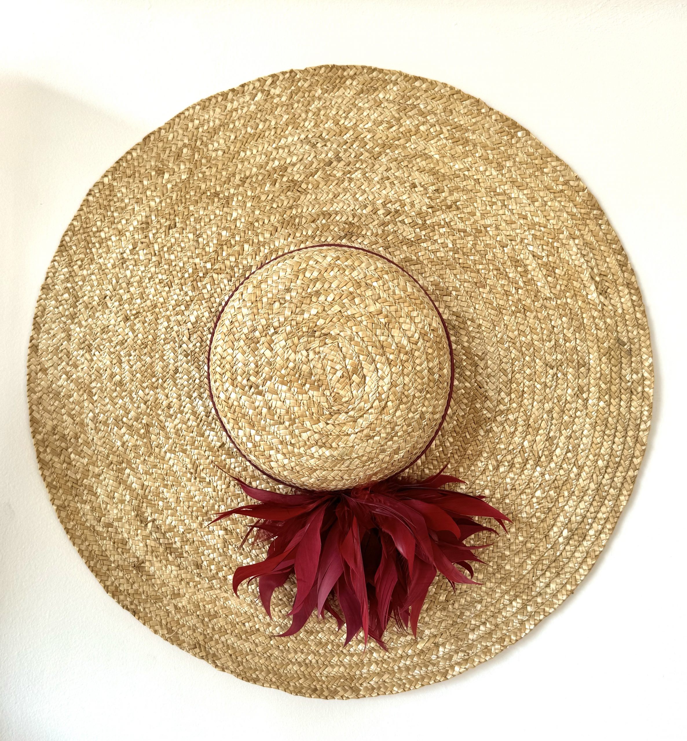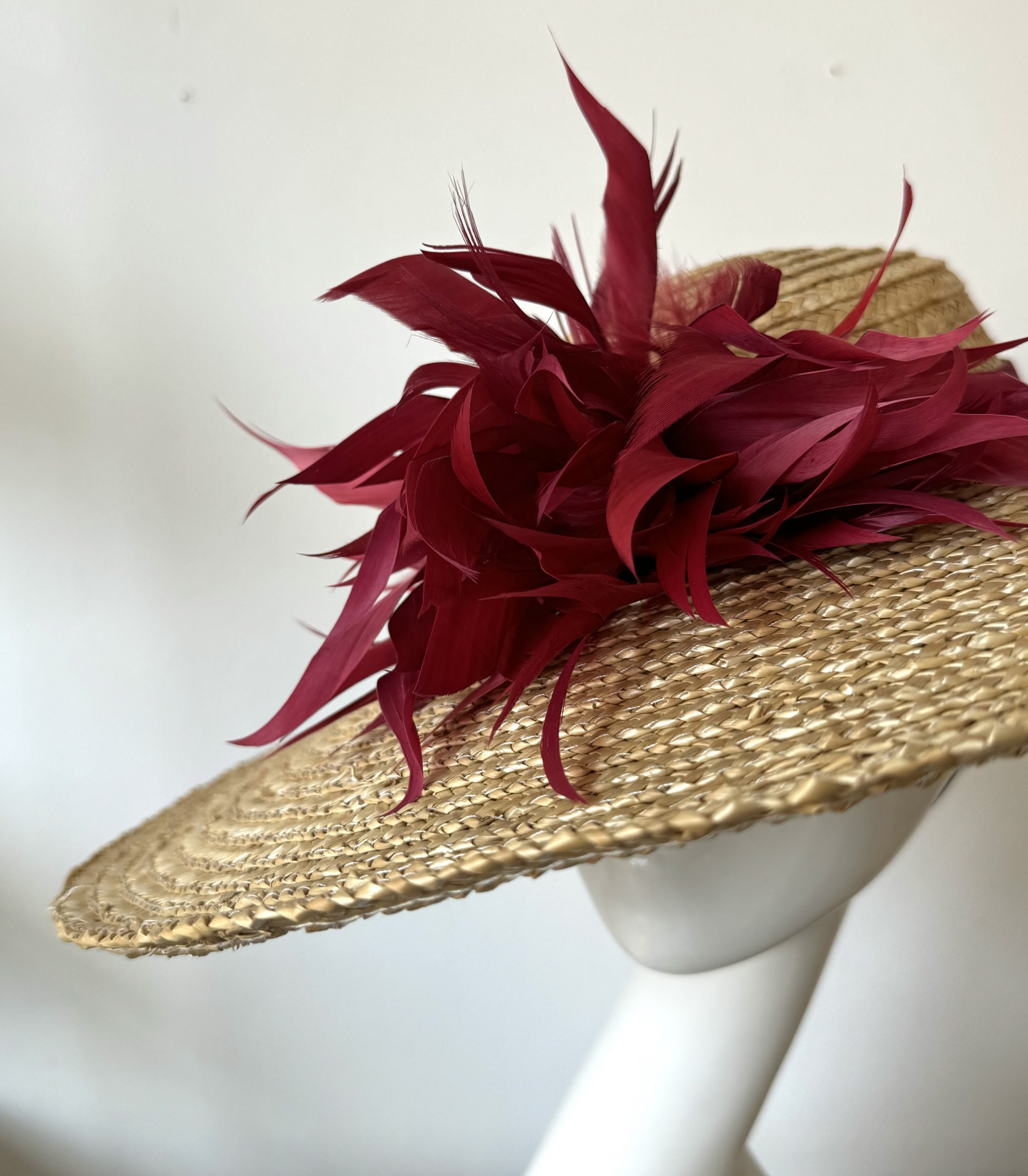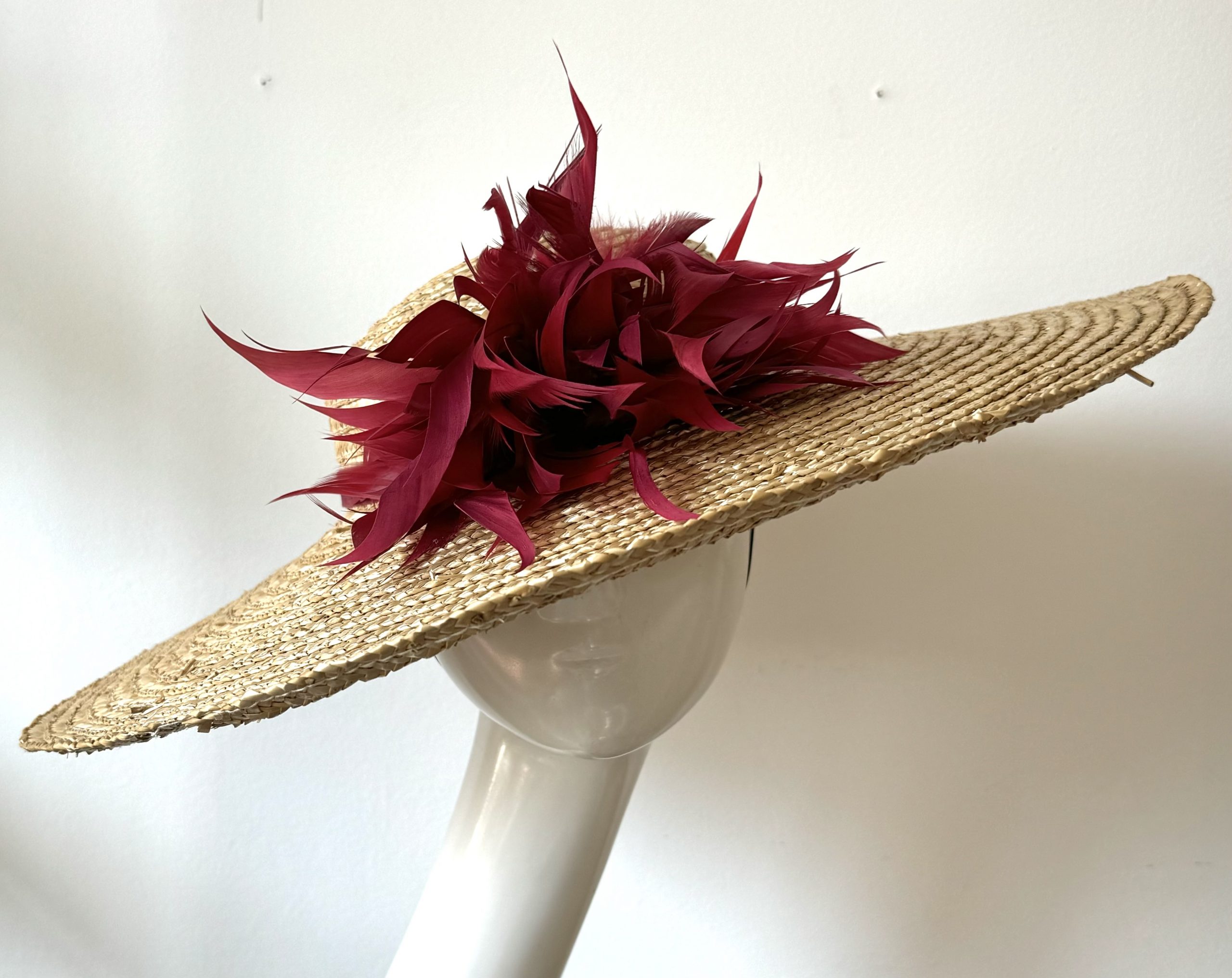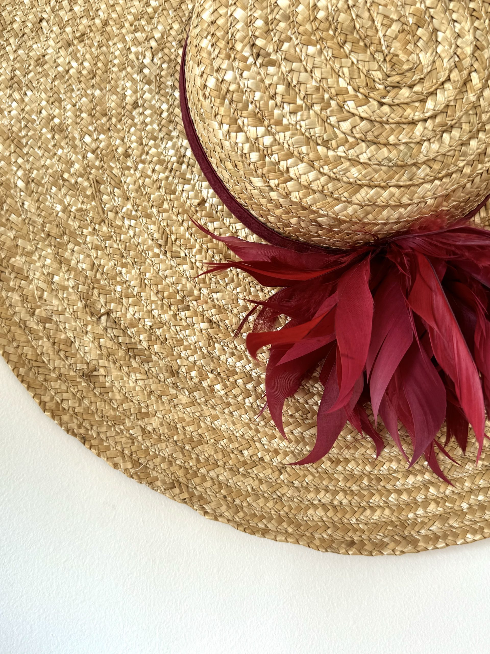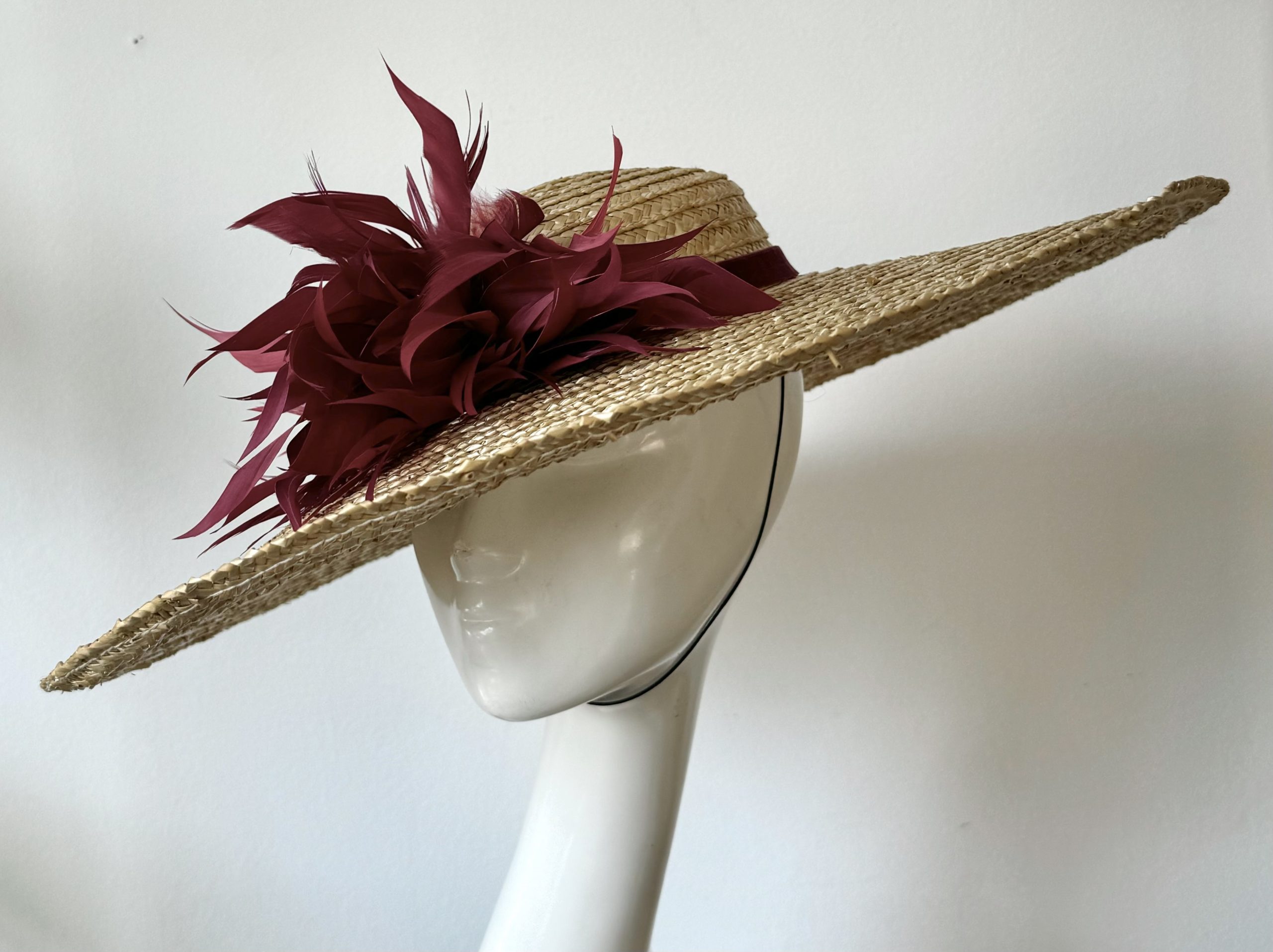 Pamela de paja natural, el ala mide 16cm, y la copa mide 6cm. El diámetro total de la pamela es de 50cm. Va sujeto a la cabeza con una goma, ya que sin ella no se sujetaría. Esta se coloca por debajo del pelo, y queda totalmente escondida, ya que es muy fina y suave. Va decorada con una flor de plumas burdeos suave. Lleva una cinta de terciopelo borgoña alrededor de todo el diámetro de la copa. Esta cinta mide 1,6cm de grosor.